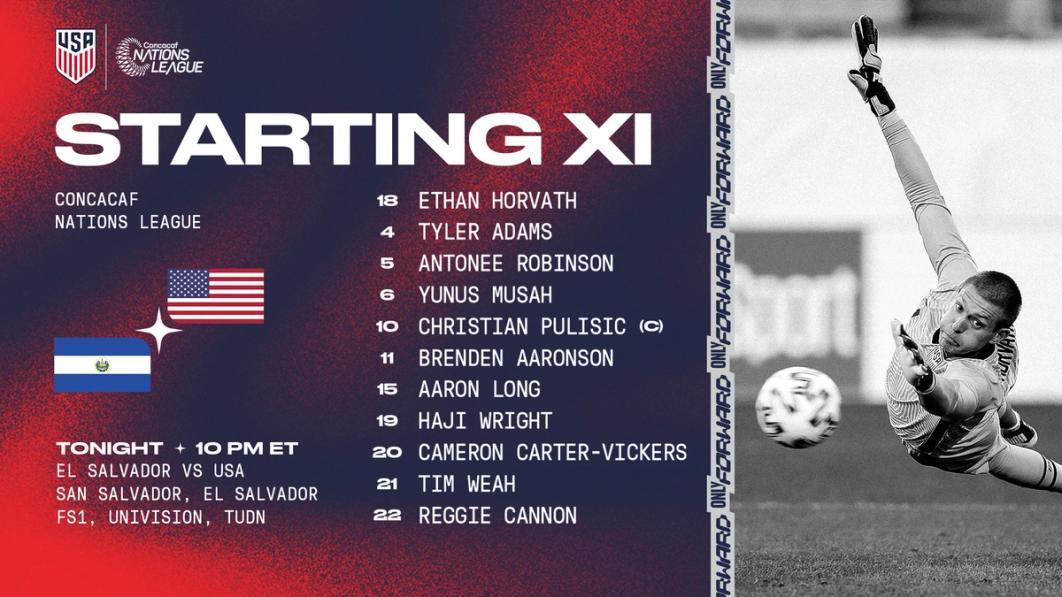 Tonight’s USMNT Starting XI at El Salvador: 18-Ethan Horvath, 4-Tyler Adams, 5-Antonee Robinson, 6-Yunus Musah, 10-Christian Pulisic, 11-Brenden Aaronson, 15-Aaron Long, 19-Haji Wright, 20-Cameron Carter-Vickers, 21-Tim Weah, 22-Reggie Cannon