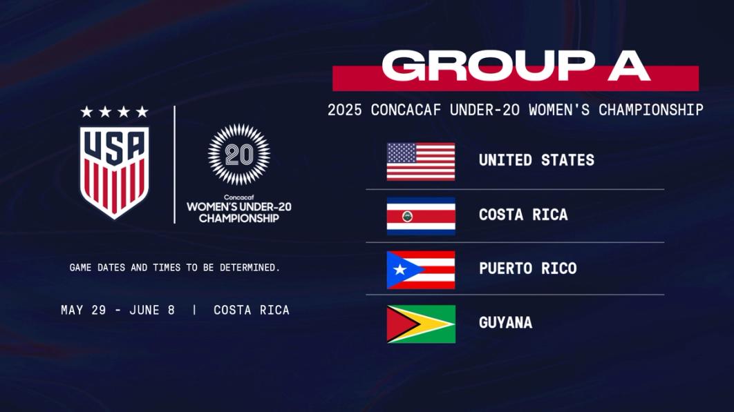 CHICAGO (March 26, 2025) – The U.S. Under-20 Women’s National Team will face Guyana on May 30 (4 p.m. ET / 2 p.m. local), Puerto Rico on June 1 (4 p.m. ET / 2 p.m. local) and host Costa Rica on June 3 (7 p.m. ET / 5 p.m. local) in Group A play at the 2025 Concacaf Women’s U-20 Championship, set for May 29-June 8 in Alajuela, Costa Rica. The top four finishers in the tournament will advance to represent the region at the 2026 FIFA U-20 Women’s World Cup in Poland.